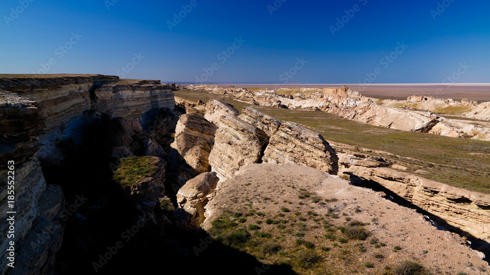Panorama view to Aral sea from the rim of Plateau Ustyurt at sunset in Karakalpakstan, Uzbekistan