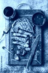 Flat-lay of grilled medium rare ribeye beef steak cut into peices on rustic wooden board with red wine and mango chutney sauce, top view