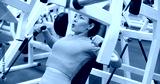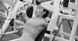 Gym workout. Bench press in hammer machine. A Caucasian woman trains her chest muscles with focused bench press reps on the hammer machine during an intense gym workout.