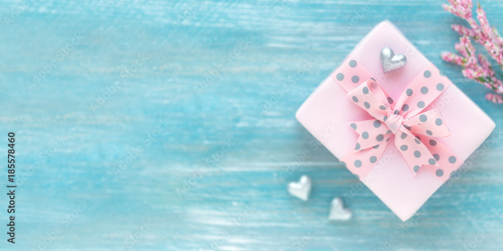 Beautiful Valentine's day banner with a pink gift box tied with a pink ribbon and decorated with silver hears on turqoise wiiden background. Overhead view with pleanty of copy space for your text