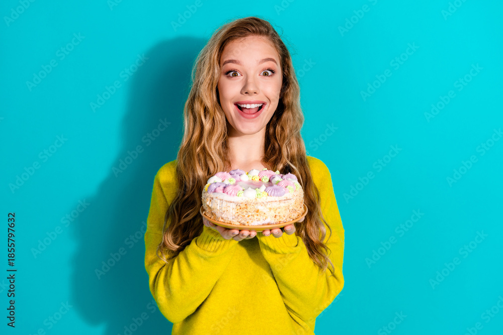 Young woman in a bright yellow sweater holds a colorful cake in front of a blue background smiling joyfully at celebration