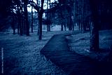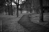 Curved wooden boardwalk path leading through a pine forest with green grass