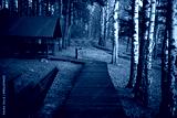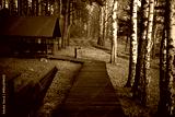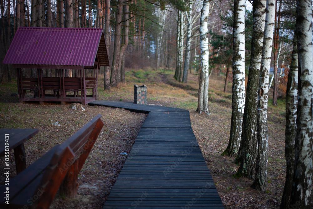 Winding wooden boardwalk path leading to a gazebo in a mixed forest park