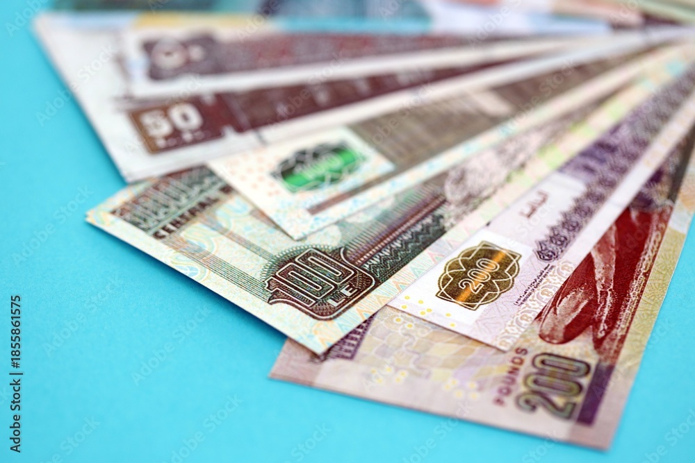 Egyptian pound money bills in big amount on blue close up. Finance and banking concept