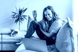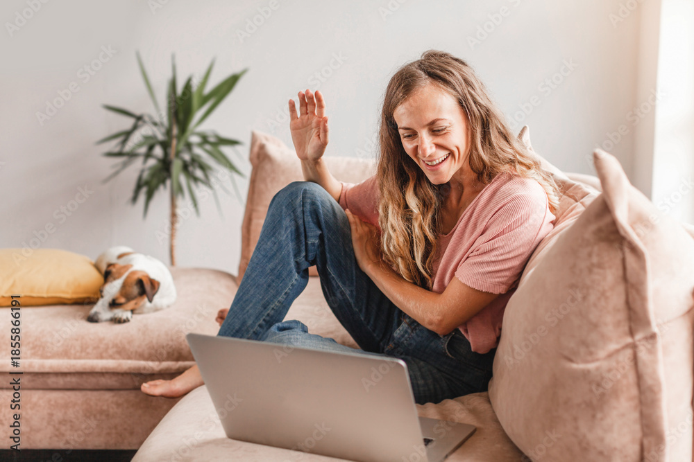 Young smiling woman waving her hand to laptop