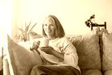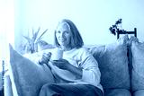 Portrait happy healthy middle aged woman sitting on comfortable couch at home