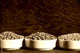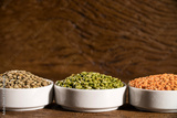 Various types of lentils (turkish, green and indian lentils) on wood background