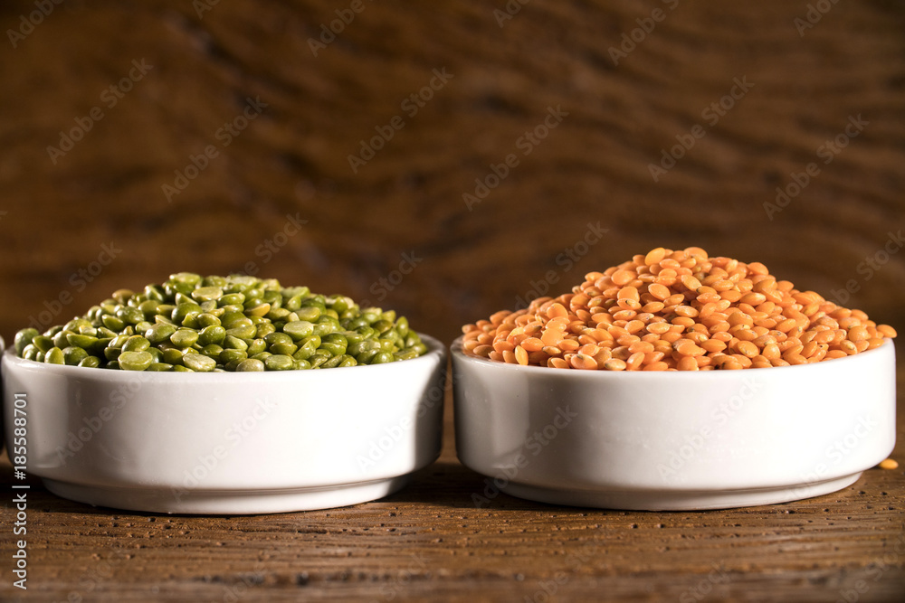 Various types of lentils (turkish, green and indian lentils) on wood background