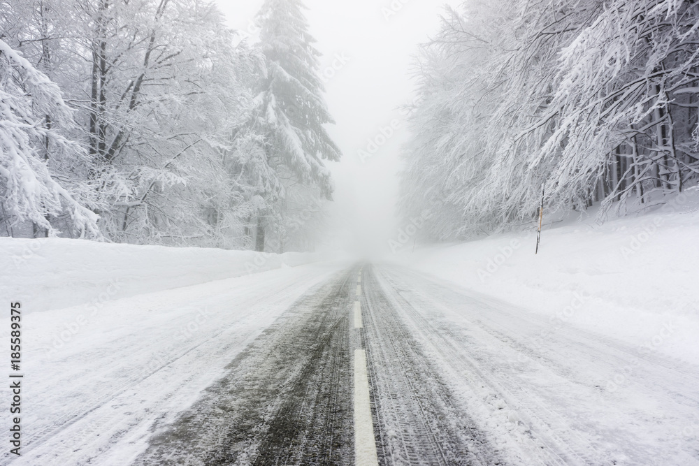 Snowy and icy road in foggy weather