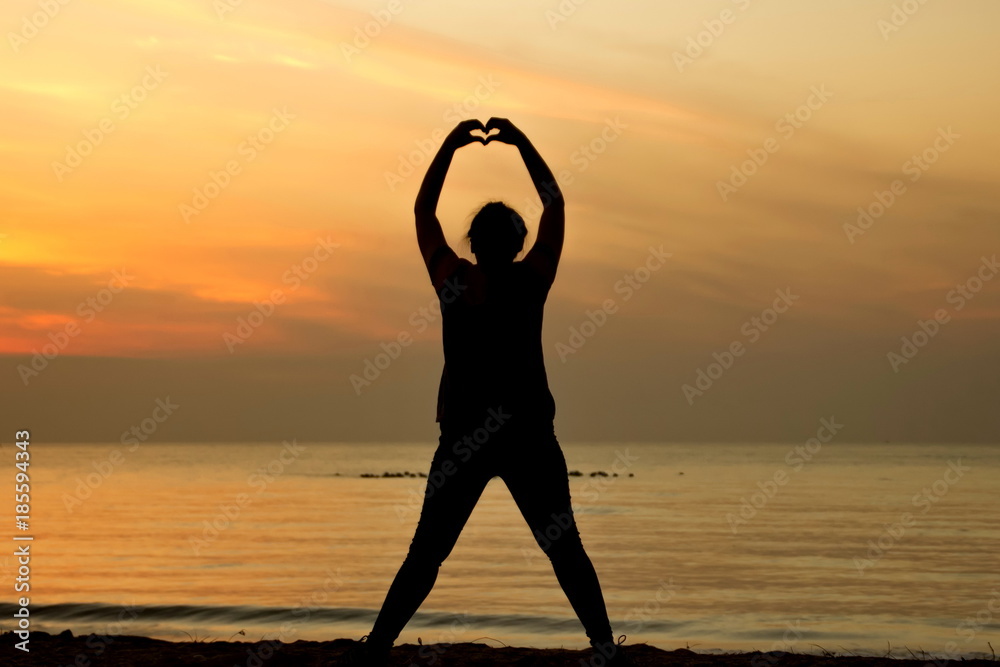 Silhouette of happy carefree woman doing a heart Shape with Hands and Yoka on the beach in the sunrise time. Relax, freedom on vacation time. Healthy living with Summer sport and freedom concept