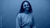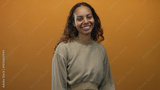 Woman smiling and relaxed wearing a casual cropped sweatshirt in an orange studio portrait; warmth confidence.