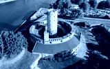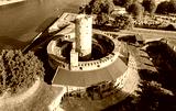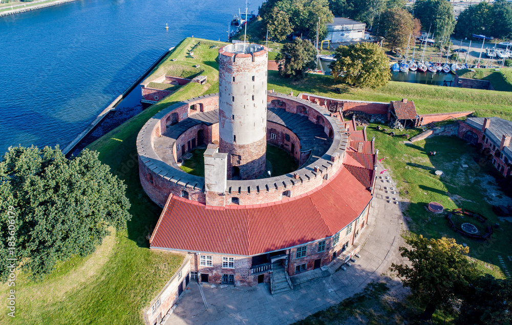 Medieval Wisloujscie Fortress with old lighthouse tower in port of Gdansk, Poland A unique monument of the fortification works. Aerial view