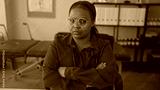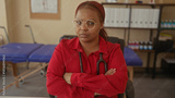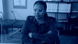 Woman with stethoscope and arms crossed at white desk in building office gazing at camera; rejection.