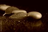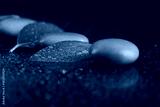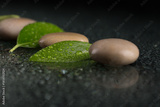 Close-up shot featuring zen stones and green leaves adorned with water droplets, arranged on a sleek, dark, reflective surface. Soft lighting enhances the scene.
