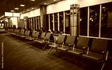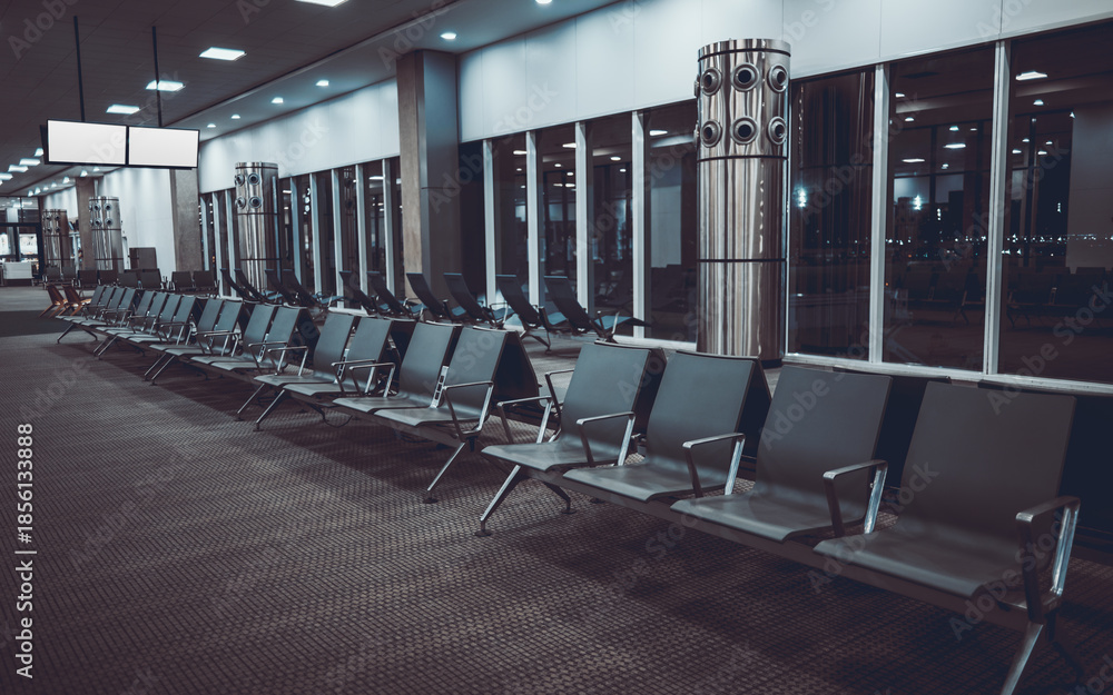 Empty airport terminal waiting area at night with long row of metal seats, glass windows, ceiling lights, columns and information monitor, quiet departure gate interior; wide-angle, low-key shot