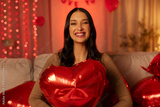 Happy woman celebrating Valentine's day, sitting on sofa holding large red heart-shaped balloon, smiling broadly, showing happiness in festive setting