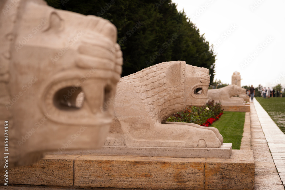 Stone lion sculptures lining the ceremonial road of lions at Anitkabir, representing strength and creating a path to turkey's national memorial and Atatürk's mausoleum in ankara