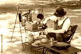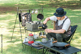 A middle-aged male camper camping solo on a grassy site at a campsite