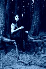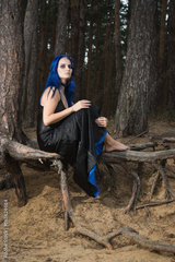 Beautiful woman with dark blue hair dressed in black dress in the magic forest
