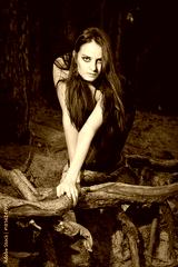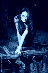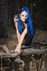 Beautiful woman with dark blue hair dressed in black dress in the magic forest