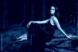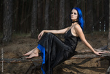 Beautiful woman with dark blue hair dressed in black dress in the magic forest