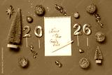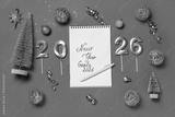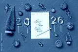 Notebook with text NEW YEAR GOALS 2026, pen and Christmas decor on blue background