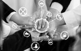 A dynamic representation of teamwork and collaboration with multiple hands placed together, symbolizing unity in achieving common goals in a professional setting. Amity