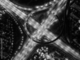 Aerial Night View of Complex Highway Interchange with Light Trails