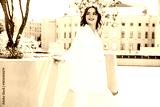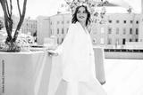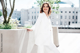 Young beautiful brunette woman wearing nice trendy white suit jacket. Sexy smiling model posing in the street at sunny day. Fashionable female outdoors. Cheerful and happy. Evening makeup, red lips