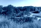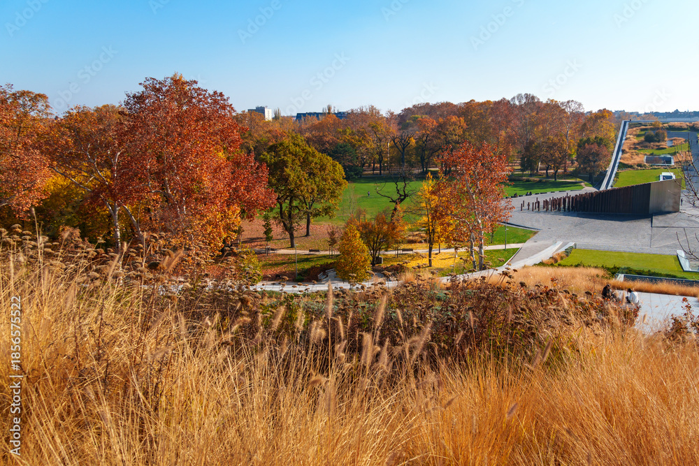 city park on a bright autumn morning, sunlight and shadows on a glade with green grass, yellow and golden autumn leaves on the trees as background, beautiful nature