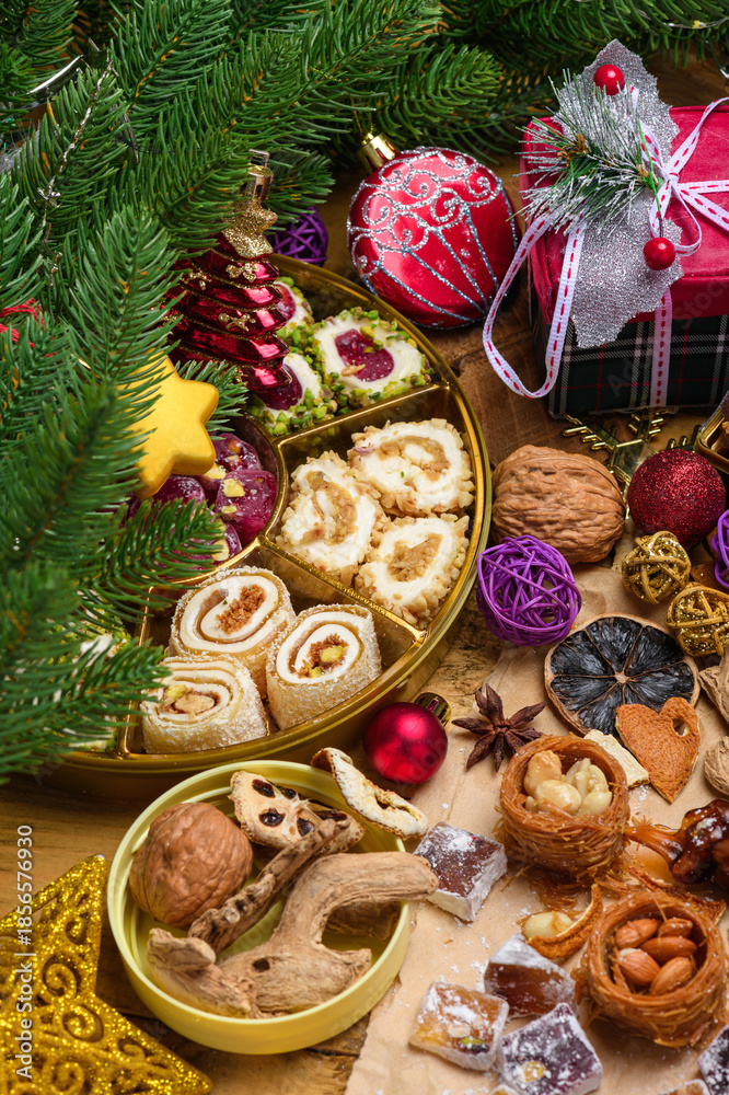 A golden tray filled with various Turkish delight rolls and nests surrounded by Christmas gifts, ornaments, and walnuts in a cozy holiday setting