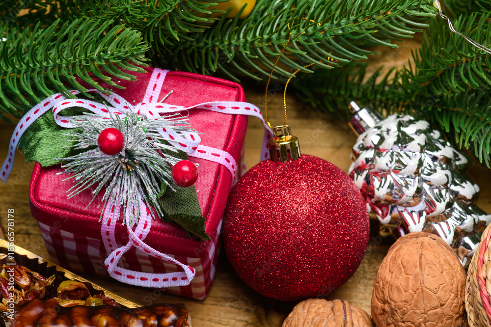 Red Christmas gift box with pine branches and festive baubles for holiday celebration