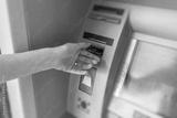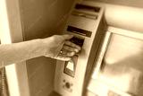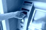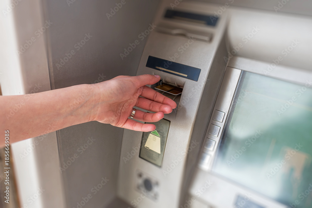 A person's hand inserting a credit card into an automated teller machine to perform a banking transaction.