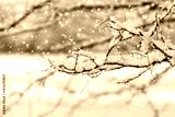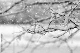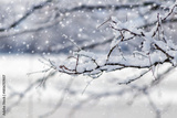 Snow-covered thin branches during snowfall with falling snowflakes on blurred winter background, frosty nature in cold weather
