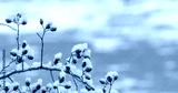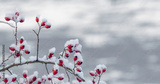 Red rose hips covered with white snow on branches on blurred winter background, frosty nature with bright berries under snow