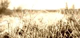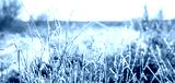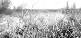 Frozen dry grass covered with hoarfrost on blurred winter background, frosty nature with ice crystals on stems in sunny weather