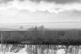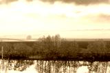 Autumn landscape with tree reflections in calm lake water under cloudy sky, natural panorama with fog and mirror water surface