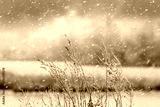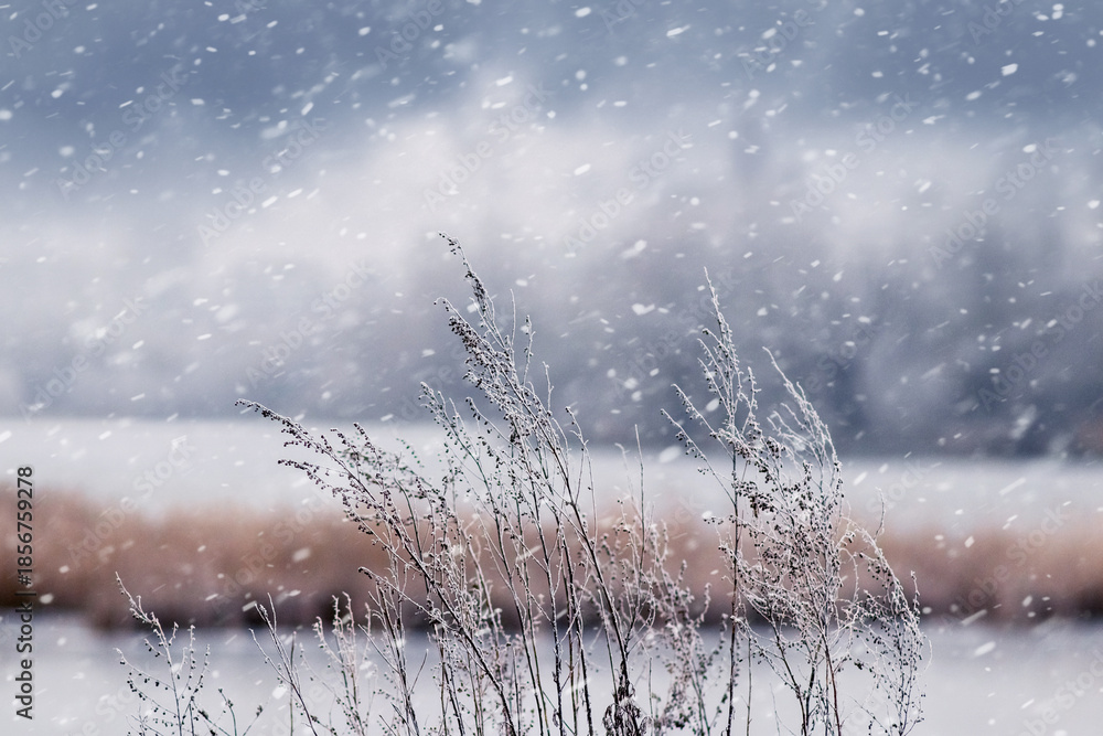 Snow-covered stems of dry grass against frozen lake during snowfall on cold winter day with blurred background
