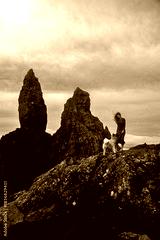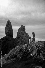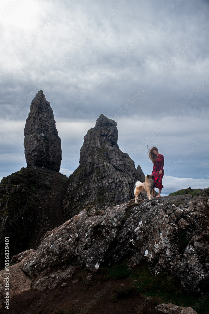Woman in Tweed Dress with Eurasier Dog at Old Man of Storr, Scotland, Travel with Dog