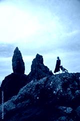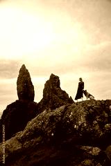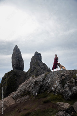 Woman in Tweed Dress with Eurasier Dog at Old Man of Storr, Scotland, Travel with Dog