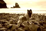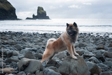 A fawn-colored Eurasier stands on Talisker Beach in Scotland, surrounded by black sand, a blue sea and a waterfall. Powerful coastal scenery captures adventure, freedom and traveling with a dog.