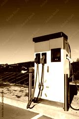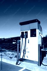 Electric vehicle charging station with two connectors, surrounded by solar panels and blue sky, showcasing sustainable energy solutions and modern technology for eco-friendly transportation