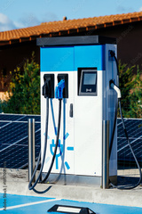 Electric vehicle charging station with multiple connectors, surrounded by solar panels, showcasing modern technology and sustainability in transportation infrastructure