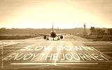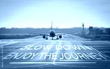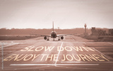 Plane taxiing down runway with Slow down enjoy the journey painted on the tarmac, promoting mindful travel, stress free trips, relaxation and appreciating the journey ahead