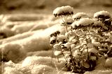 Winter atmospheric landscape with frost-covered dry plants during snowfall. Winter Christmas background