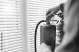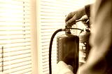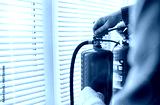 Fire extinguisher has hand engineer inspection checking pressure gauges to prepare fire equipment for protection and prevent emergency and safety rescue and alarm system training concept.