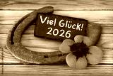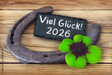 Glückssymbole Kleeblatt mit Hufeisen und Viel Glück 2026 auf Holz
