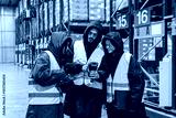 Group of diverse workers managing inventory with barcode scanner and clipboard in a low temperature cold storage logistics warehouse