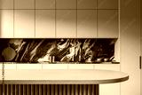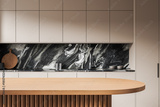 Modern kitchen interior with marble backsplash, minimal beige cabinets, and wooden island in elegant contemporary design. 3D Rendering. 3D Rendering