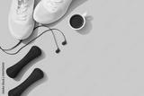 Female fitness flat lay, sneakers, dumbbells, notebook planner on blue background, feminine sports and energy template